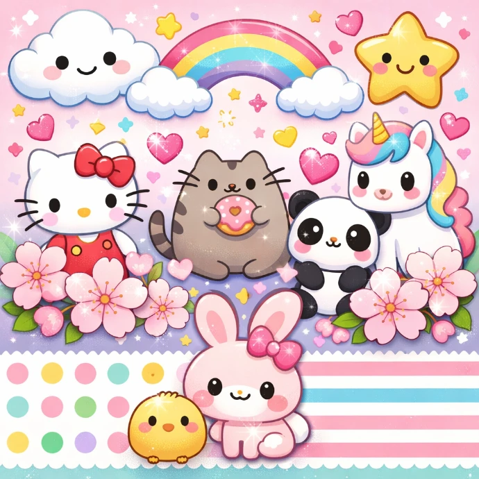 - Accessoires : oreilles de chat, couronnes, lunettes kawaii