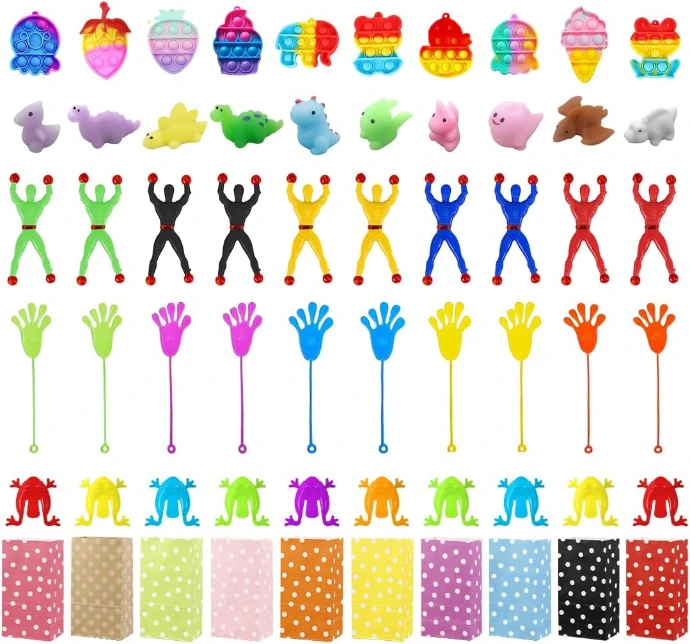 Ce pack comprend 10 pochettes cadeaux en papier, chacune contenant 5 jouets différents, soit 50 jouets au total.